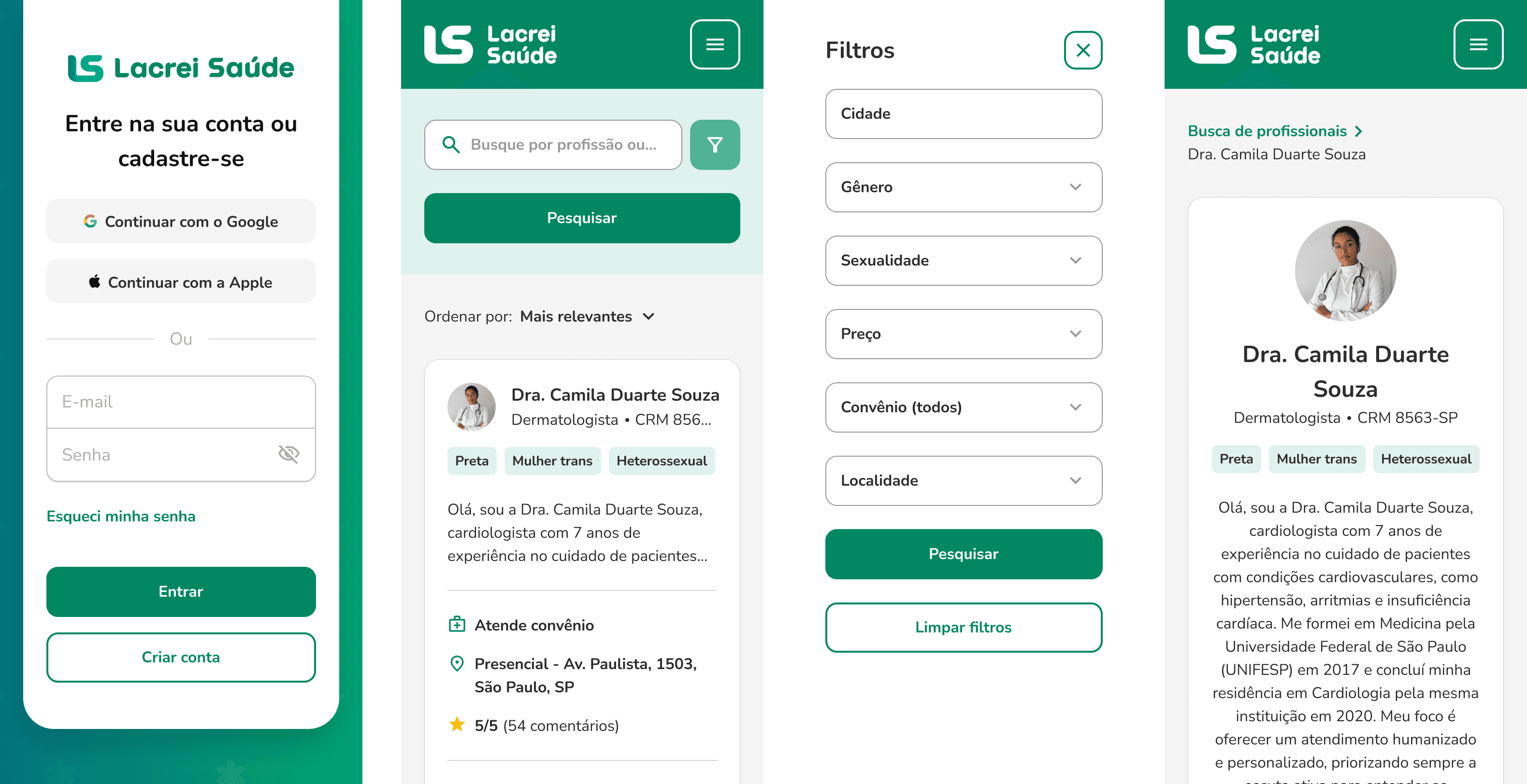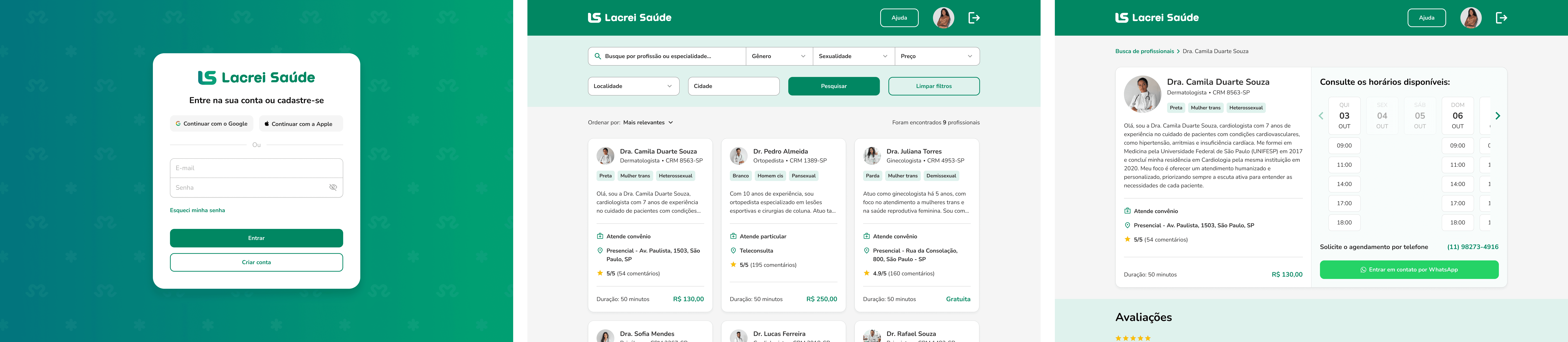 Considere que você foi a pessoa selecionada para desenvolver o fluxo de telas (web e mobile), do fluxo da jornada da pessoa usuária da Lacrei Saúde, que possibilite a esta fazer o login buscando as pessoas profissionais por localização, verificar os serviços e entrar em contato.